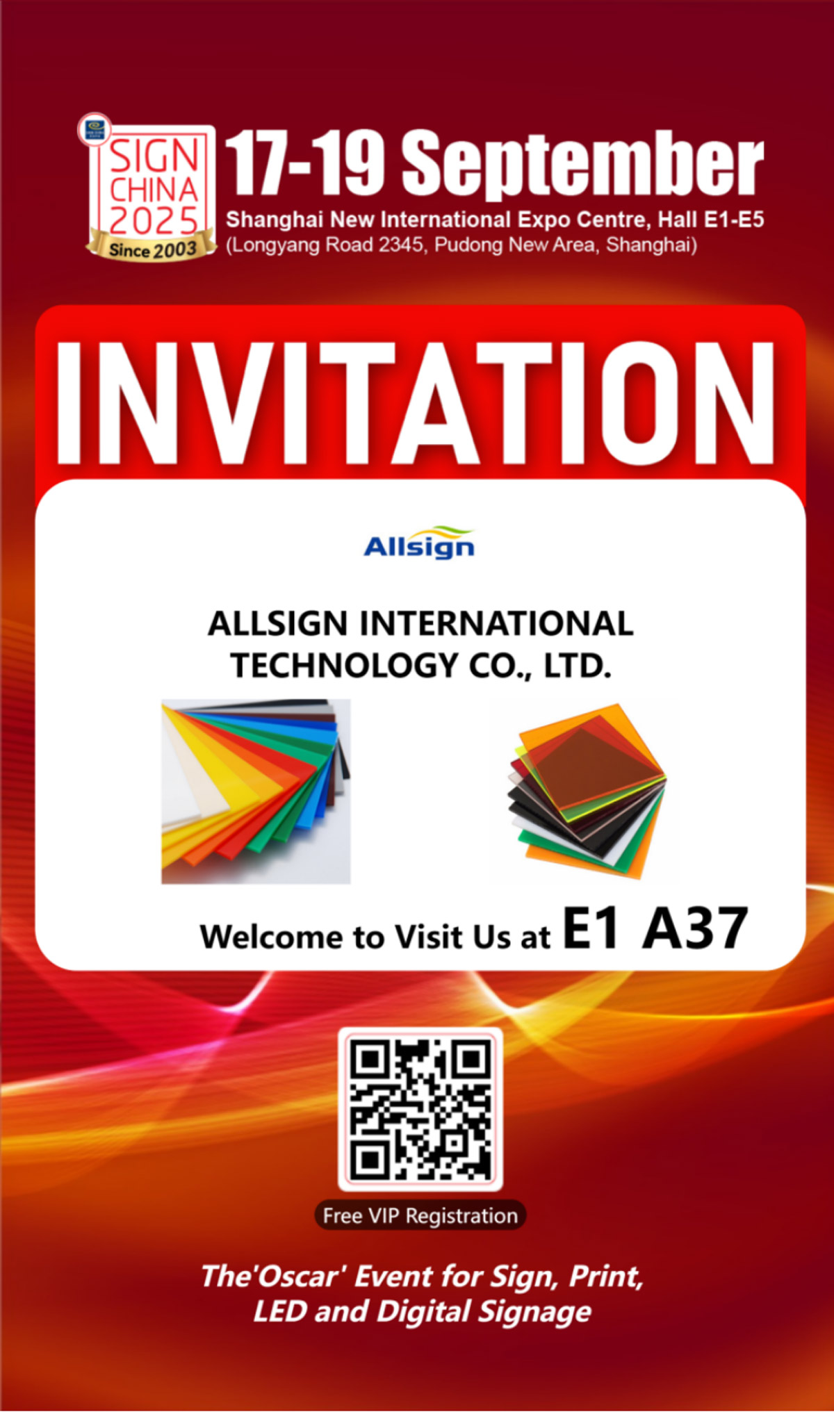 Whether you are an advertising agency, a signage production enterprise, or a retailer in need of purchasing high-quality materials for marketing displays, we sincerely invite you to visit Booth A37, Hall E1 at SIGN CHINA 2025, and experience in person how Allsign's acrylic sheets and PVC foam boards can create greater value for your advertising and display projects.